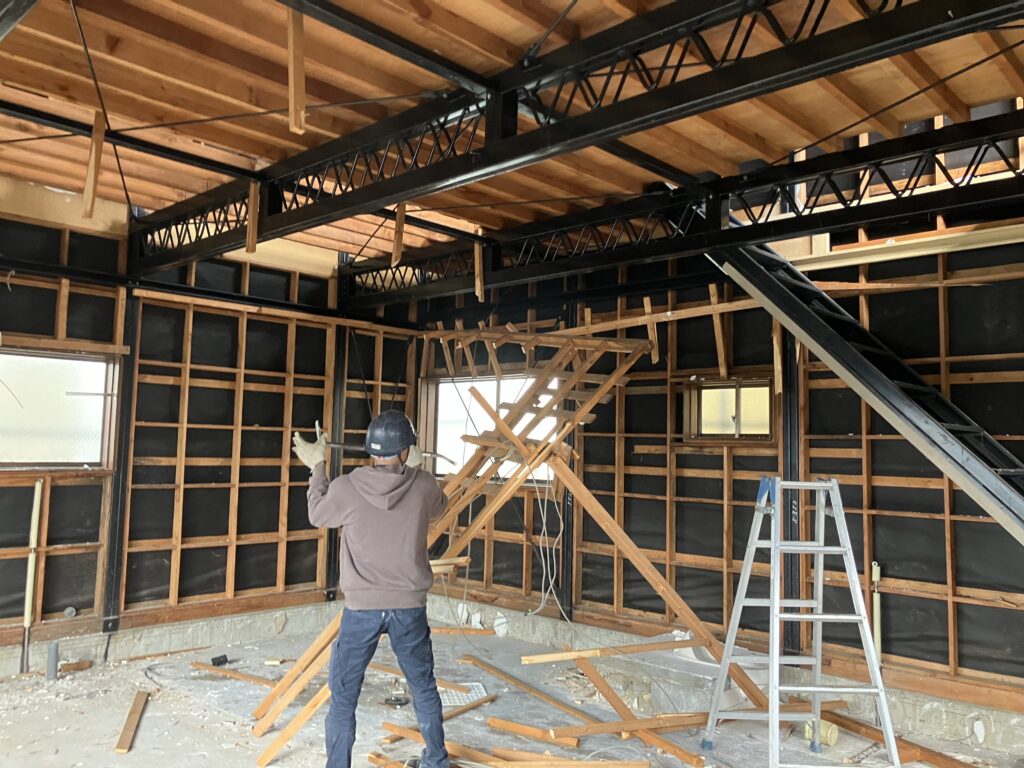 まずは、内装の処理を行いますが事務所兼倉庫としていたので内装がしっかりとしており、石膏ボードや木材は全て取り除く必要がありました。