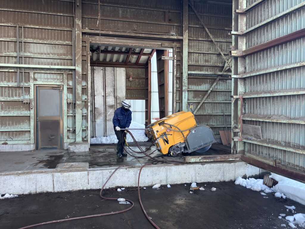 まず、コンクリートにカッター入れを行い手作業と並行して捲りました。